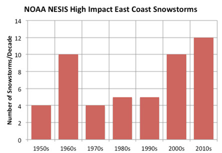 As for snowfall, just 4 years into this decade, we have had more high impact east coast snowstorms (Kocin -Uccellini storms) than any decade since the 1950s.
